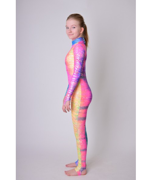Akrobatik-Kostüm für verschiedene Tanzstille aus glänzendem, regenbogenfarbenem Lycra.